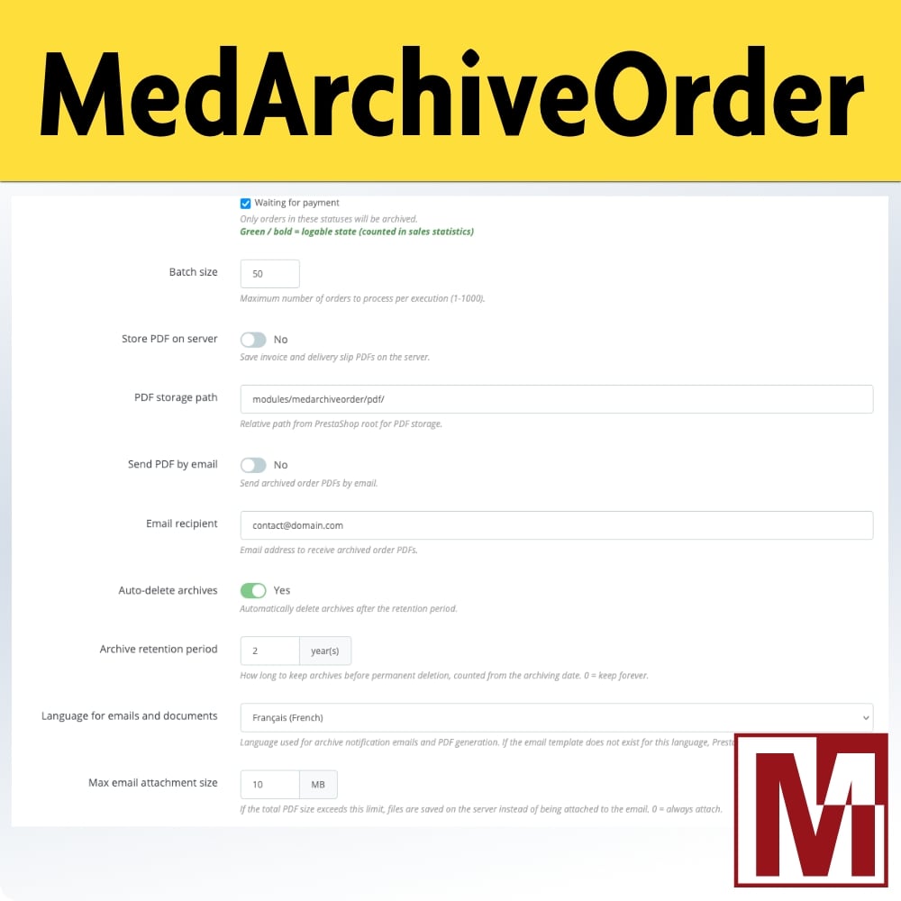 For merchants subject to time-limited retention obligations, the module offers scheduled automatic deletion. Set a retention period (in years) and expired archives will be automatically purged: PDF files are removed from the server and the archive is flagged as deleted.