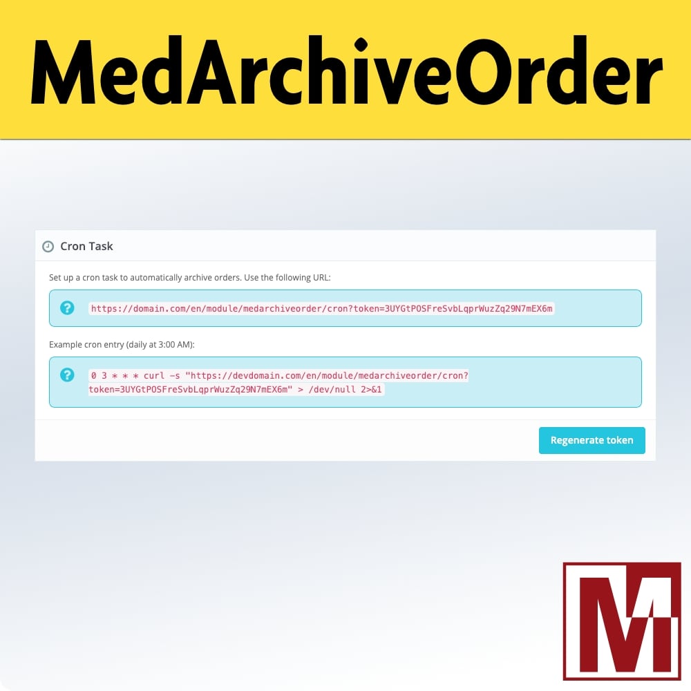 The entire process — archiving and purging — can be fully automated via a CRON task. The module provides a URL secured by a 32-character token, displayed on the configuration page. A daily run during off-peak hours is enough to maintain an optimal database without any manual intervention.