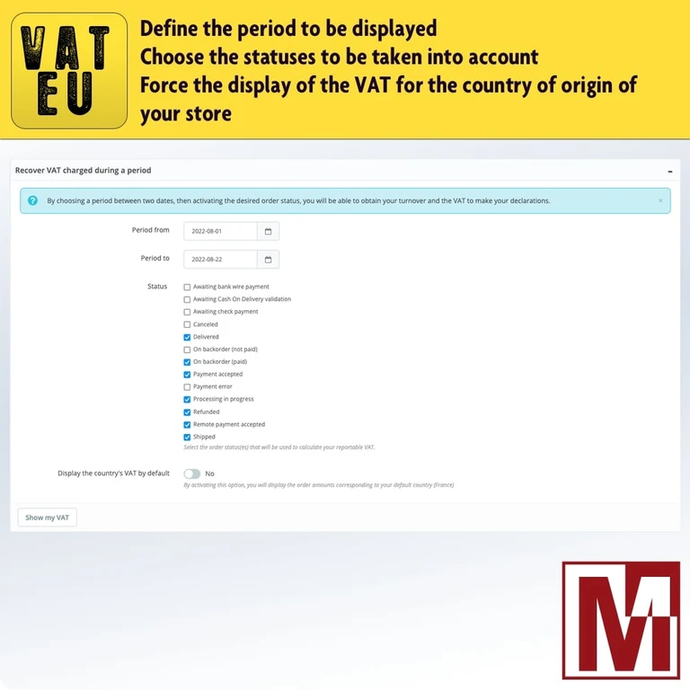The module automatically selects during its installation the status considered as billable - Possibility to display the results also for the native country of the store if you want to check the corresponding values