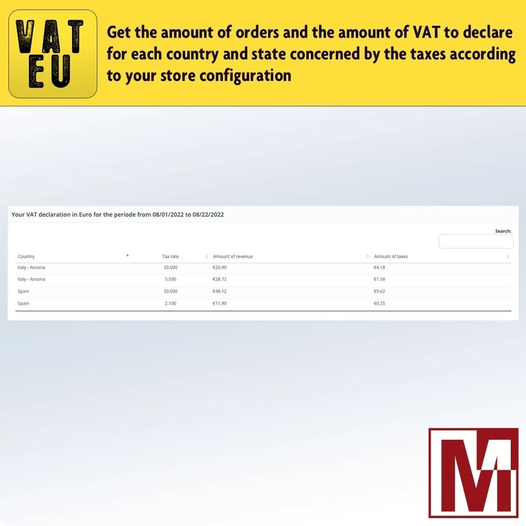 The module will display a table by currency containing, for each, the list of all the VAT declarations to be made by country and by tax value.