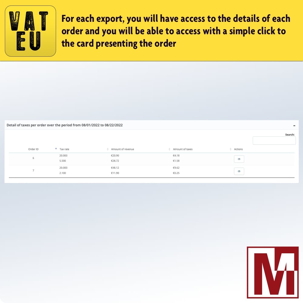 This table displays one line per order and indicates the tax rates, the amounts and even allows you, with a simple click, to access the order on your store to refer to it if needed.