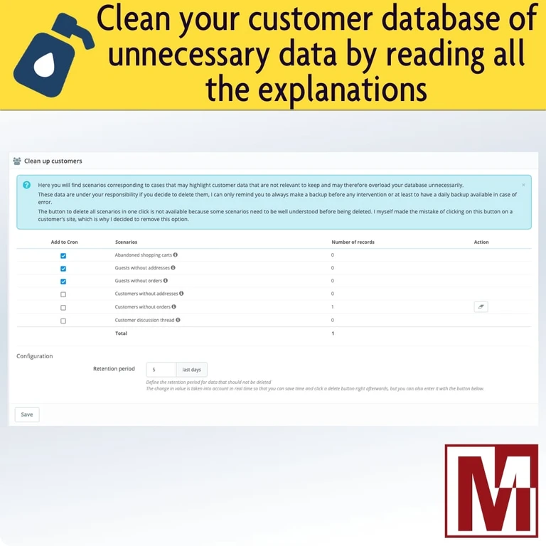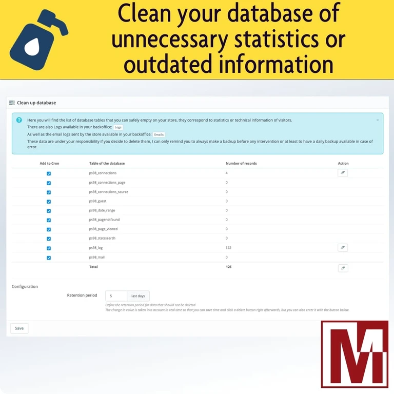 - Addons : https://addons.prestashop.com/en/website-performance/87733-maintenance-and-cleaning-of-your-store.html
