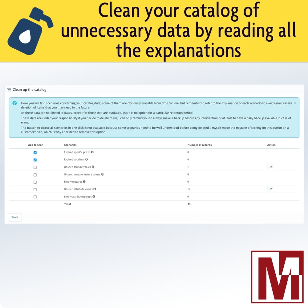 This update of this flagship module to maintain and keep the performance of your PrestaShop store in version 1.3.0 brings a very useful feature, especially for stores using third party systems to fill their product catalog.