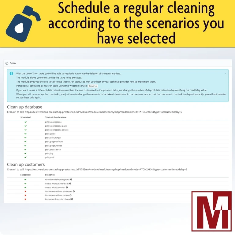- PrestaToolbox : https://www.prestatoolbox.com/administrative-tools/457-automate-the-cleaning-of-your-prestashop-store.html